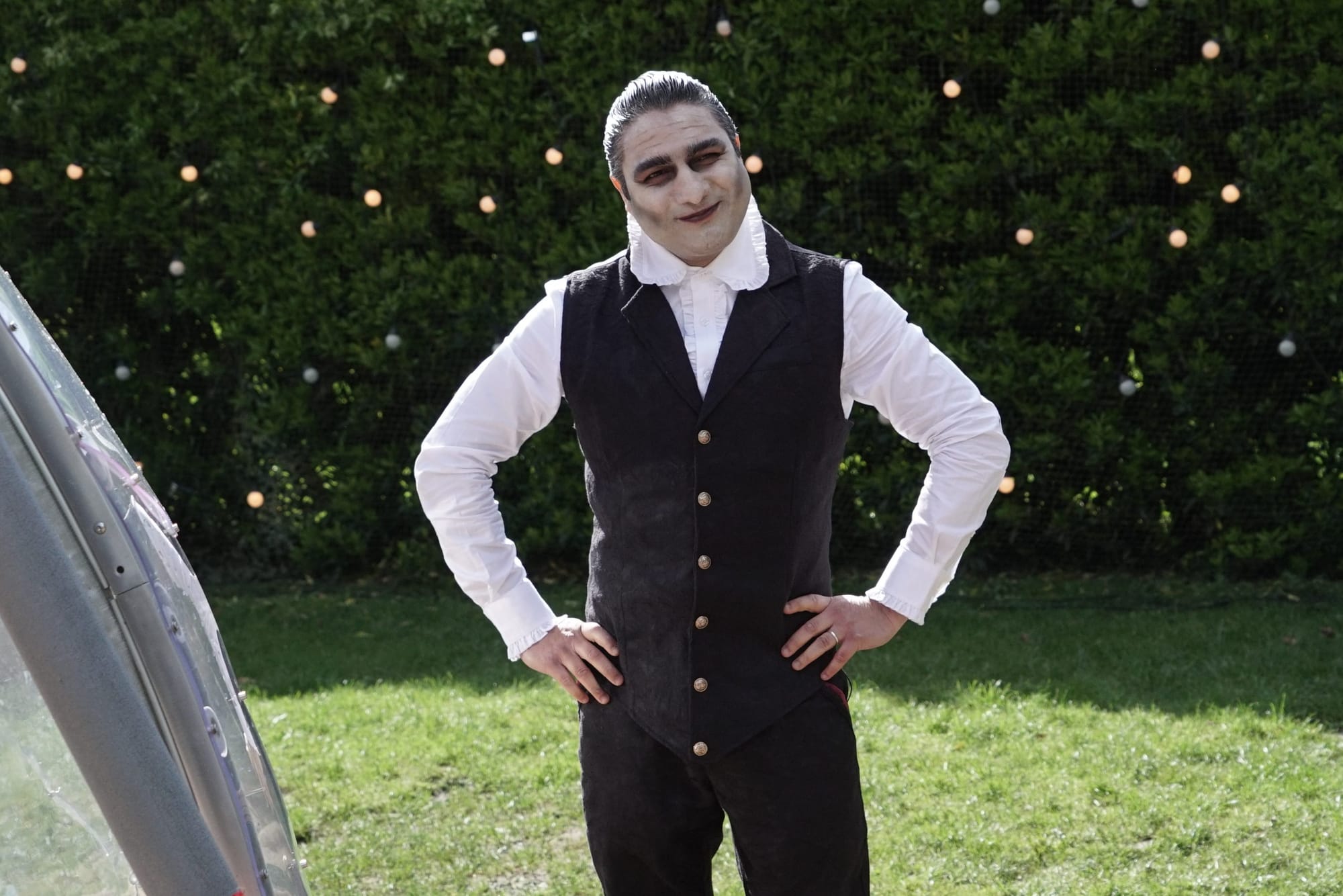 If he wasn't so famous I would probably go easier on him. It doesn't feel quite correct to ask a Pakistani actor to have any respect at all for British cultural institutions; I think despising the concept of English comedy in general would be pretty fair for someone whose grandparents lived through Partition. I'm not saying being by far the most famous person to have been on the show cancels that out, of course, but it does make me personally feel better about slamming him for this lazy-ass, uninspired fit. You're from Hollywood! You have access to stylists! Many of your fellow contestants have never even heard of stylists! (Yes, I do consider using a stylist for your task fit cheating and if I ever hear of anyone doing it I'll be severely disappointed.)